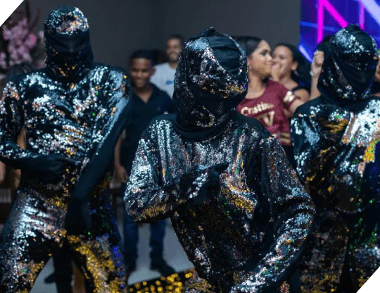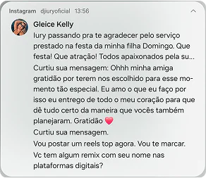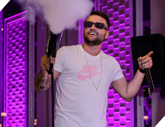 Apresentação com nosso DJ principal, conduzindo um show vibrante e personalizado com efeitos especiais.