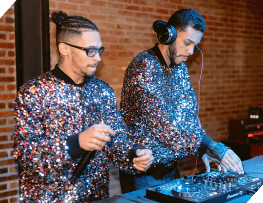 Duelo de DJs tocando juntos, criando uma experiência sonora única e envolvente com efeitos especiais.